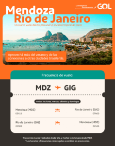 Les comunicamos la confirmación del nuevo vuelo directo Mendoza – Río de Janeiro, que será operado por la aerolínea brasileña Gol. Esta crucial conexión comenzará a funcionar a partir del próximo 5 de enero, fortaleciendo el arribo de visitantes de Brasil, uno de los mercados emisores más importantes para el destino cordillerano.